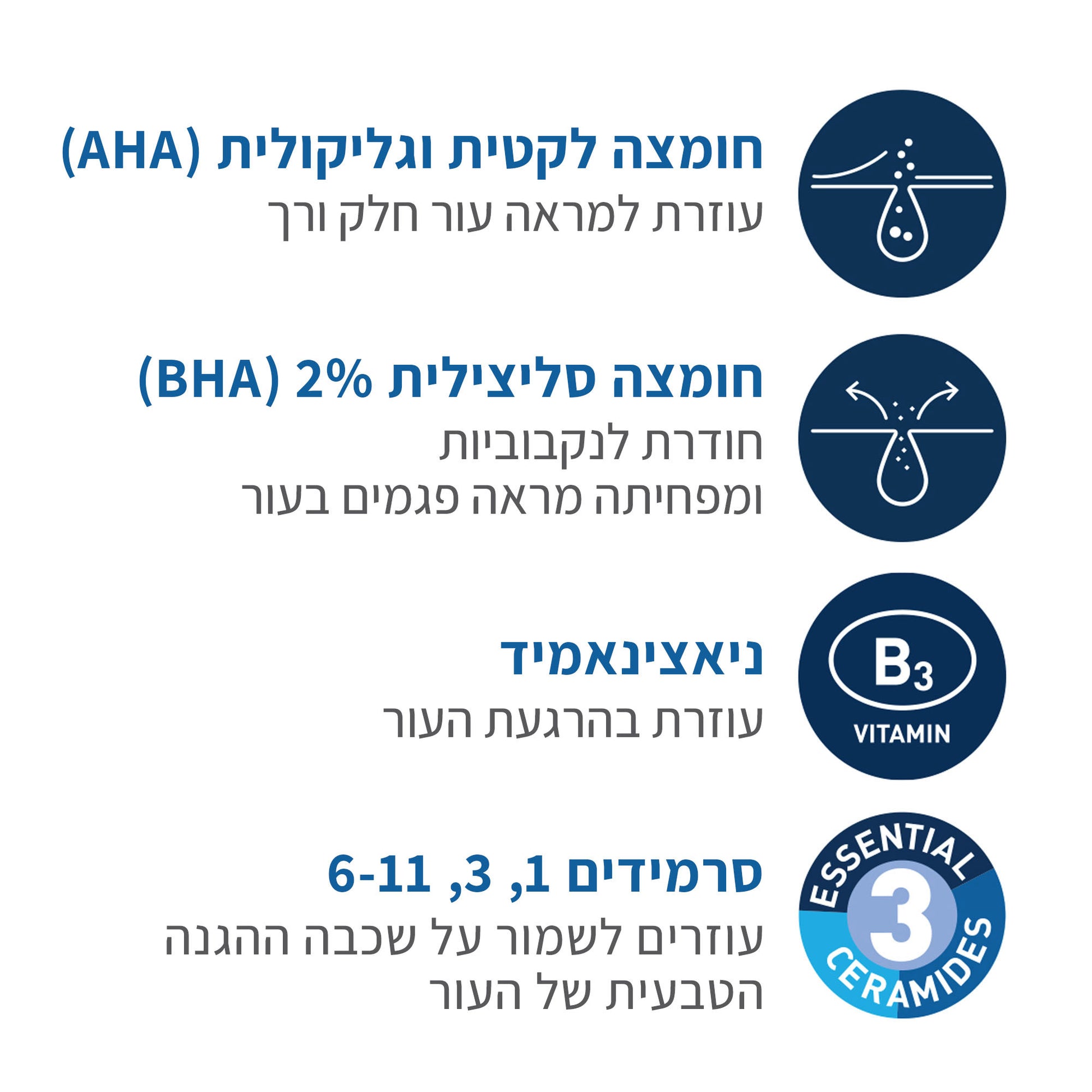 הפורמולה הייחודית מכילה 3 סרמידים חיוניים, חומצה סליצילית, ניאצינאמיד וטכנולוגיה לספיגת שומן. רכיבים אלו מתוכננים לנקות ביסודיות, להפחית מראה נקבוביות ופגעי עור, ולהסיר עודפי שומן מבלי לפגוע בשכבת ההגנה הטבעית של העור. זה מתאים במיוחד אם יש לך עור שמן הנוטה לפצעונים ואת מחפשת מוצר שיטפל בפגמים מבלי לייבש את העור.