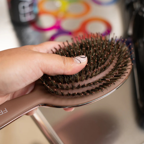 מברשת עיצוב מקצועית מבית FRAMAR עם זיפי חזיר אמיתיים וזיפים להתרת קשרים, אידיאלית לעיצובים חלקים וגלישים ובטוחה לשימוש בייבוש בפן.