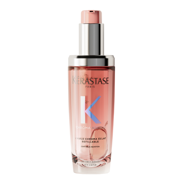 שמן כרומה אקלט Kerastase L'Huile Chroma Éclat מגיע בעיצוב חדש ואריזה הניתנת למילוי חוזר. השמן המזין מעניק לשיער צבוע זוהר מתמשך, הגנה על הצבע ומראה בריא וחיוני, והוא מכיל סנטלה אסיאטיקה הידועה ביכולות השמירה והחיזוק שלה.
