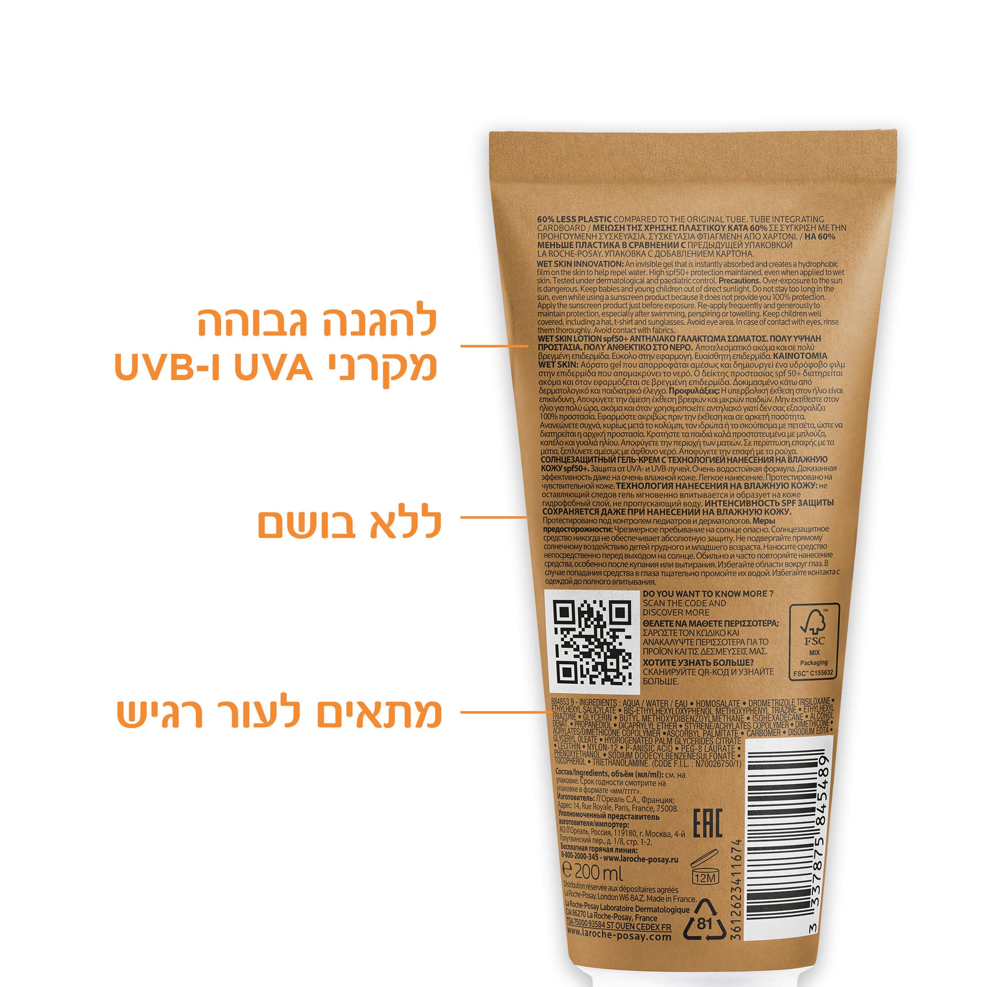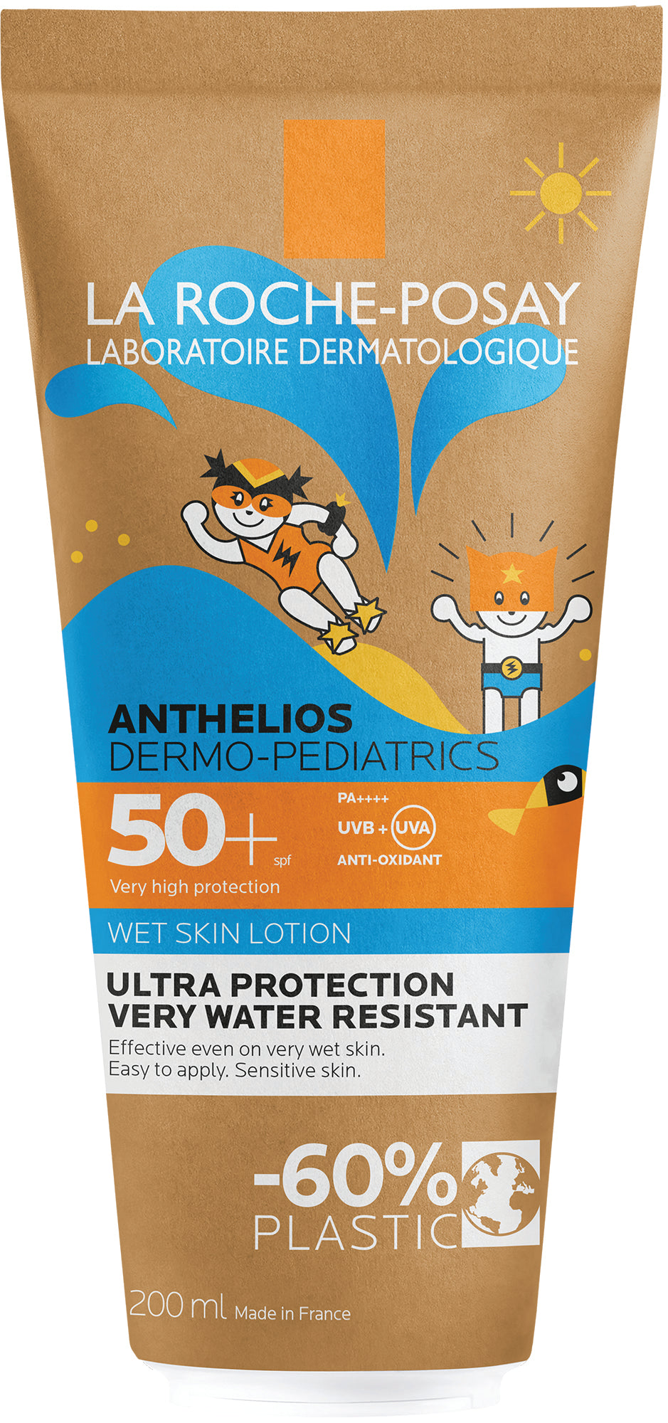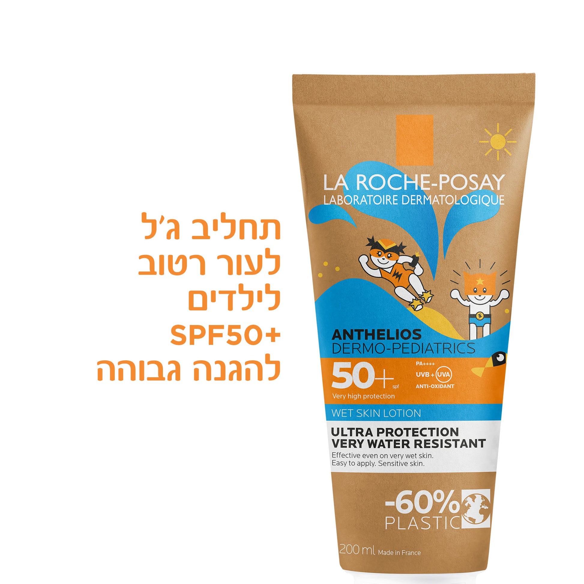 תחליב ג'ל להגנה מהשמש לעור רטוב לילדים עם מקדם הגנה SPF-50+ באריזה מופחתת פלסטיק 200 מ"ל - לה רוש פוזה