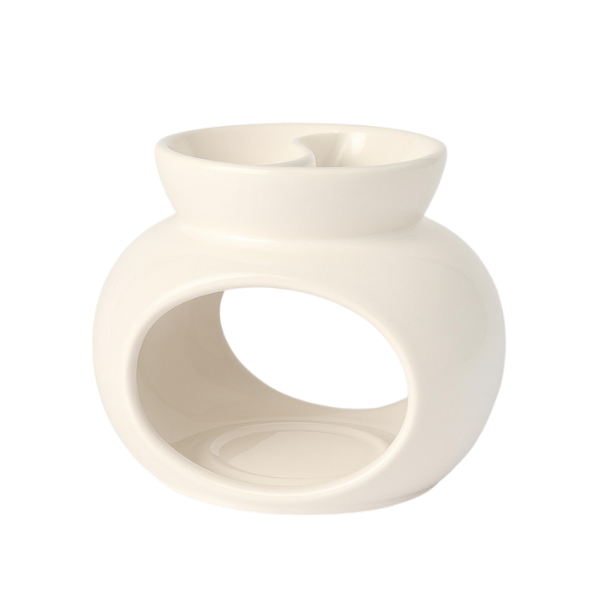 מבער ארומה מעוצב בגוון לבן קלאסי, בגודל של 13 ס"מ גובה ו-15 ס"מ רוחב.