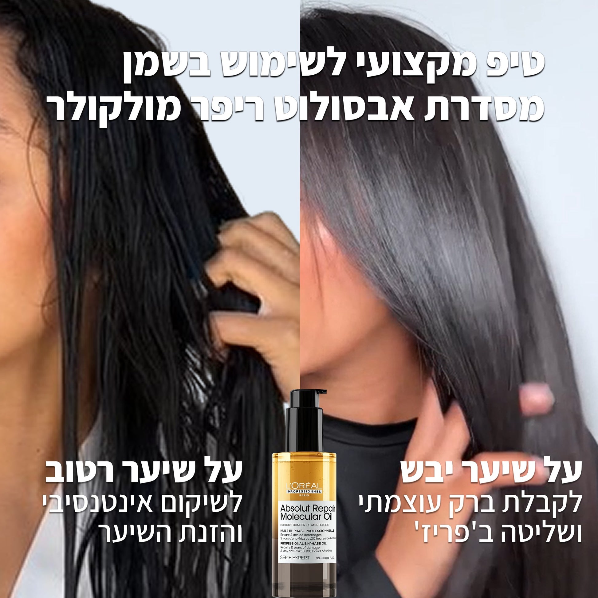 מתמודדת עם שיער פגום עם מבנה מולקולרי מושחת? שמן דו פאזי של לוריאל הוא הפתרון המושלם – שמן דו-פאזי עם טכנולוגיה מוגנת בפטנט לשיקום מולקולרי, שמעניק שיקום כפול עד 3 ימים של שליטה בפריזים וברק.