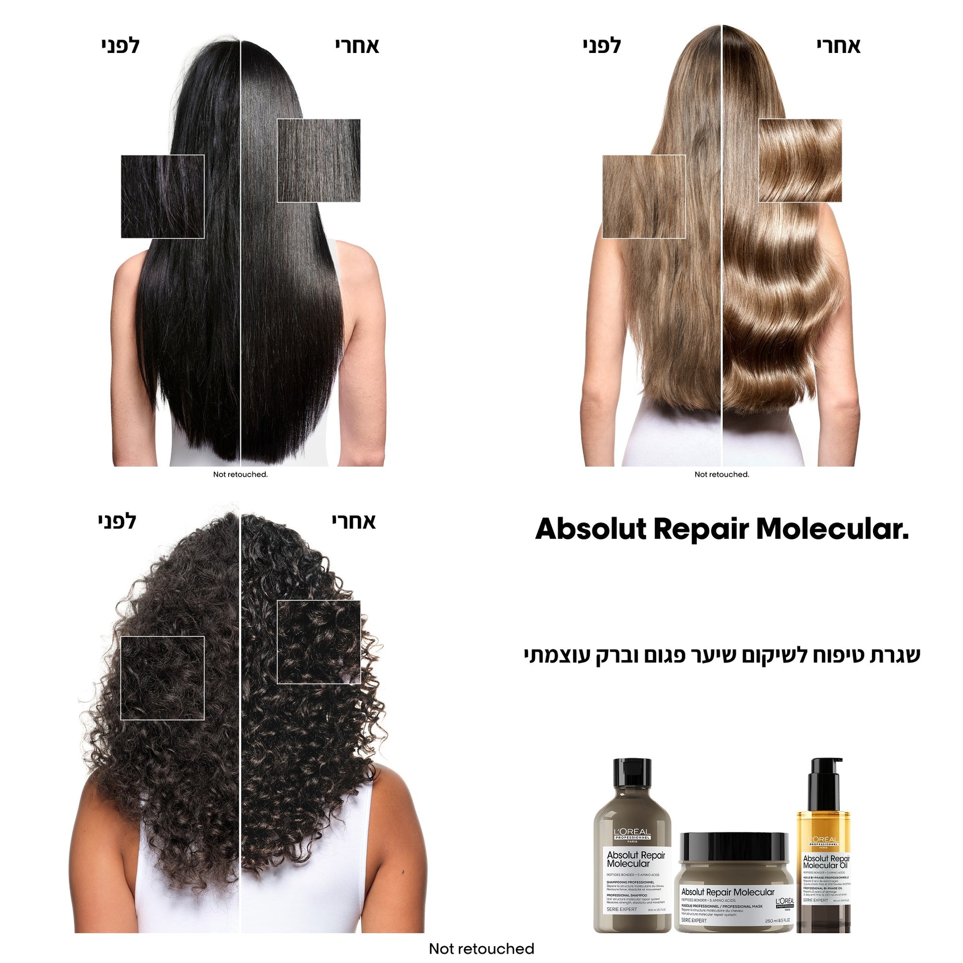 השמן הדו-פאזי מוסיף לשיער שיקום מולקולרי עמוק, חוזק וצמצום שבירה, וברק ושליטה בפריזים עד 3 ימים. הוא אידיאלי לשימוש על שיער לח או יבש לאחר הניקוי, מתאים לכל השיער הפגום: צבוע, מובהר וטבעי, ומשלים את טיפול הסלון המולקולרי. הפורמולה המקצועית קלילה, נספגת מהר ובעלת ניחוח ממושך שעוצב על ידי מומחי בשמים יוקרתיים. השמן פותח במשותף עם 3 מומחי שיקום מקצועיים מהעולם.